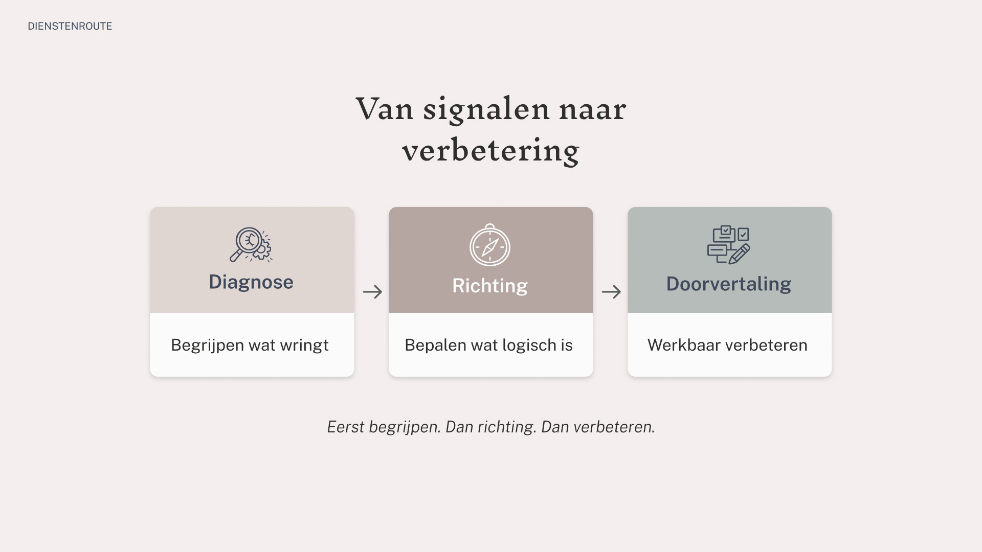 Voor situaties waarin de richting helder is en het tijd is om inzichten zorgvuldig door te vertalen naar concrete verbetering.