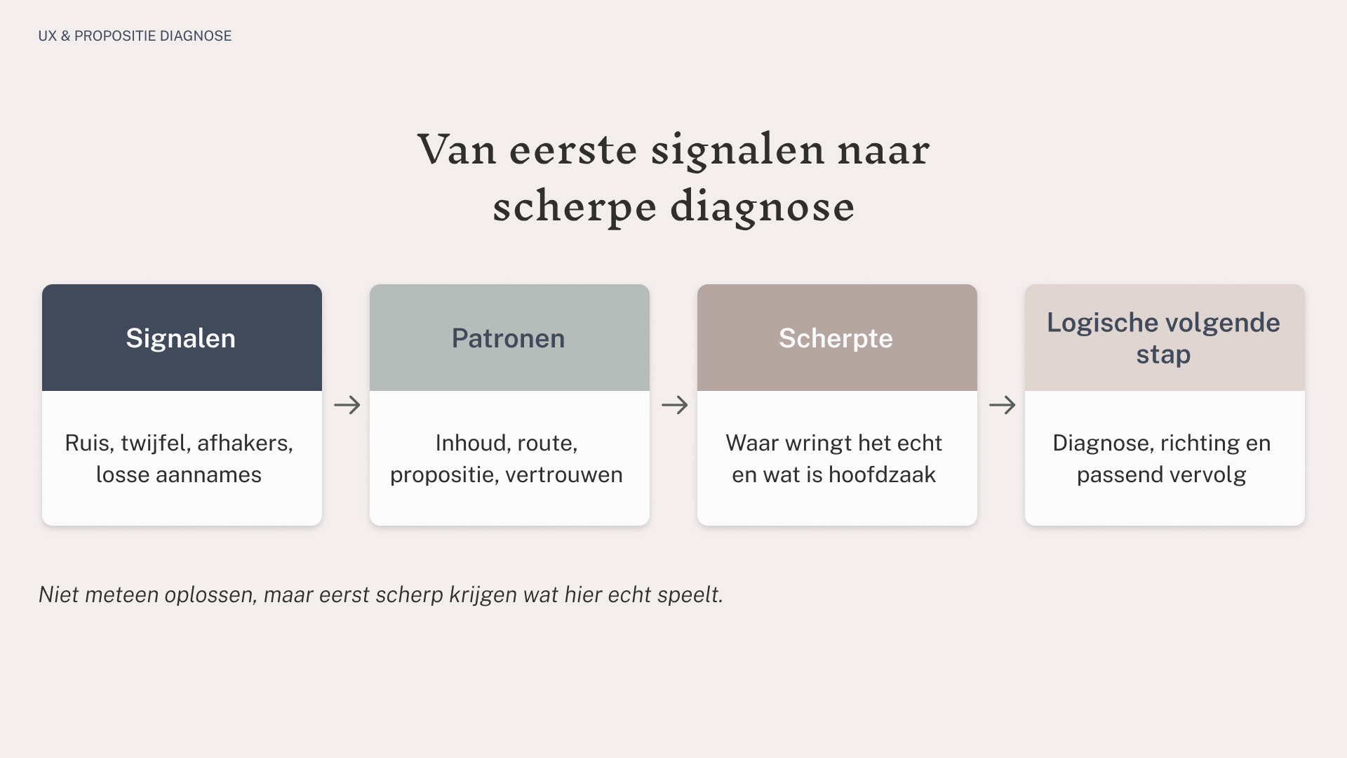 Je hoeft nog niet precies te weten waar het wringt. Als je voelt dat er iets schuurt in je website, propositie of digitale route, is een scherpe eerste stap vaak zinvoller dan direct een groter traject te starten.