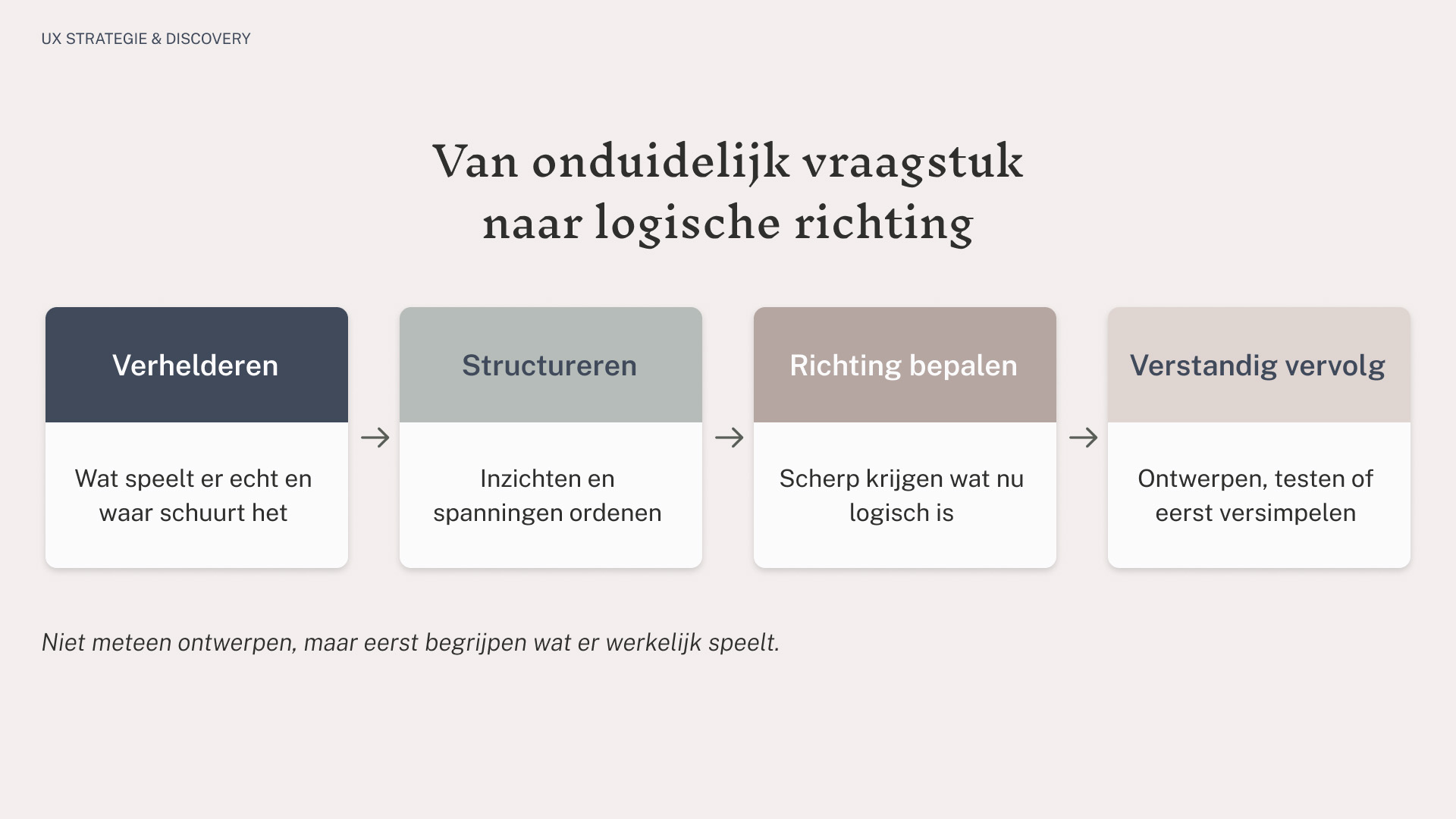 Voor vraagstukken waar eerst inzicht, structuur en richting nodig zijn voordat er een grotere keuze, herbouw of vervolgtraject volgt.