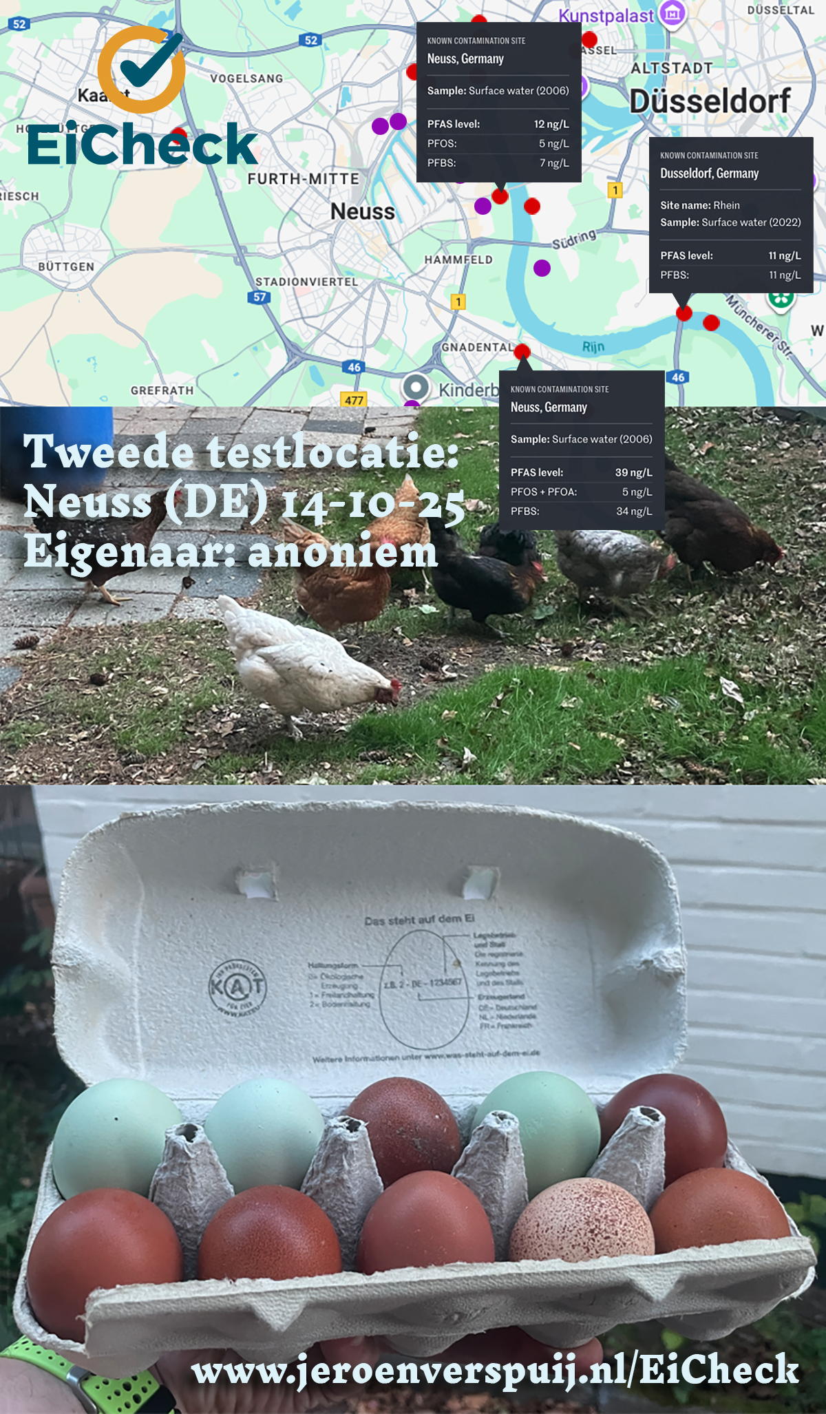 | Neuss (DE) | 17-10-25 | 06-11-25 | Tweede testlocatie bij particuliere houder in Neuss (NRW). PFOS-waarde 1,9 µg/kg en som 4 PFAS 2,1 µg/kg → boven EU-grenswaarde (1,7 µg/kg). Niet bestemd voor verkoop of consumptie boven 2–3 eieren per week. |